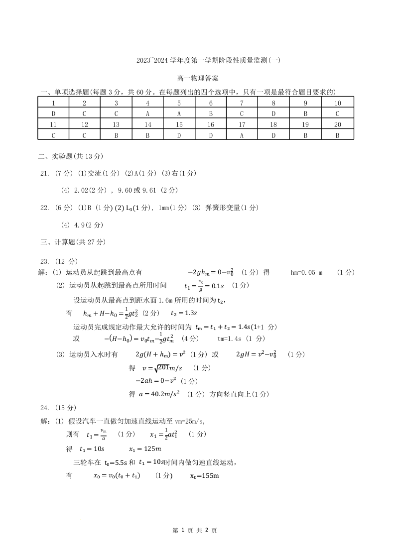 天津市南开区2023-2024学年高一上学期11月期中考试物理答案
