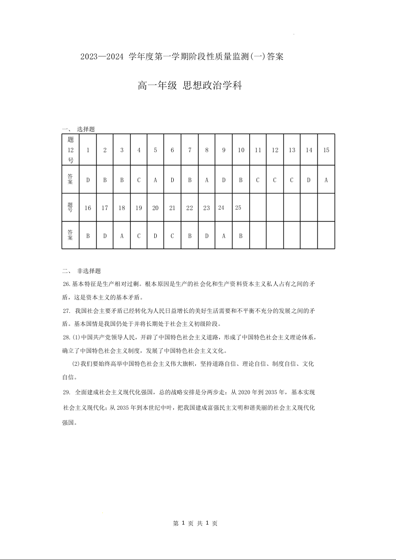 天津市南开区2023-2024学年高一上学期11月期中考试政治答案