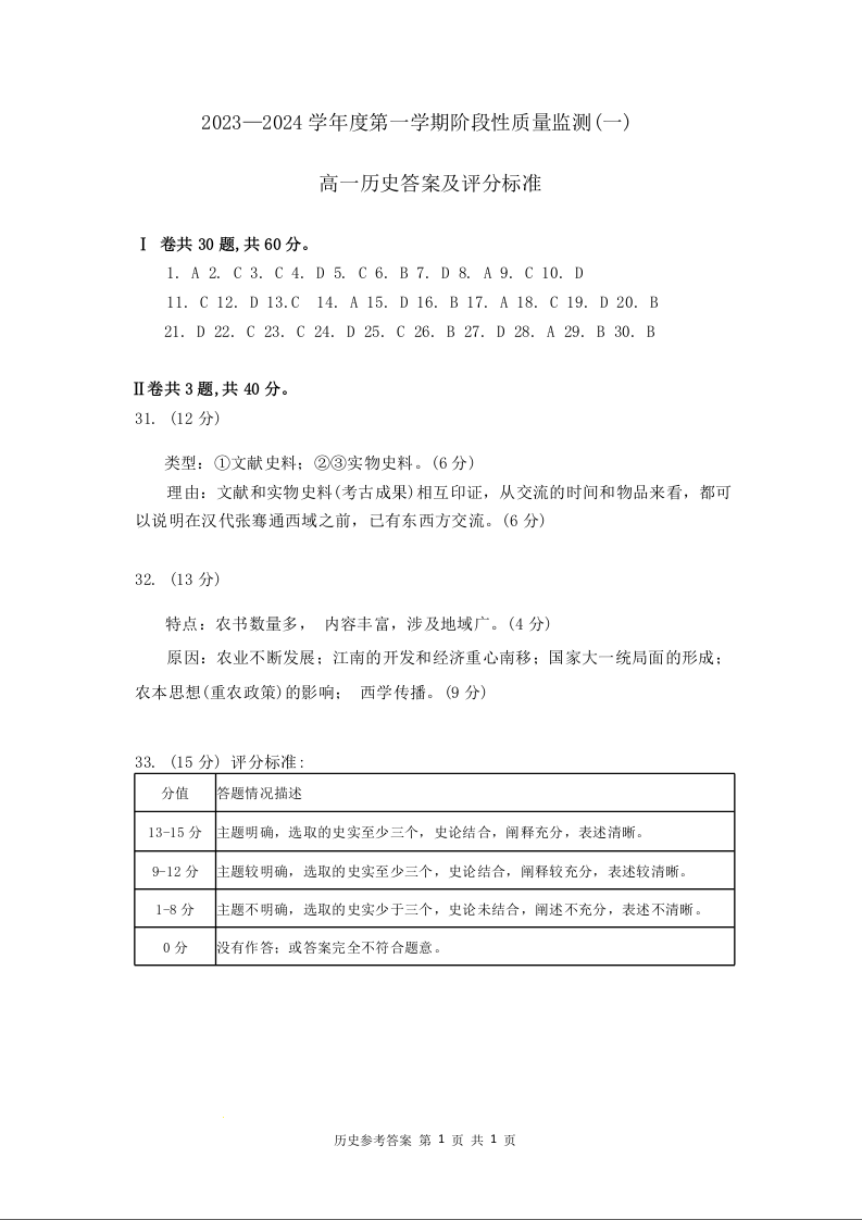 天津市南开区2023-2024学年高一上学期11月期中考试历史答案