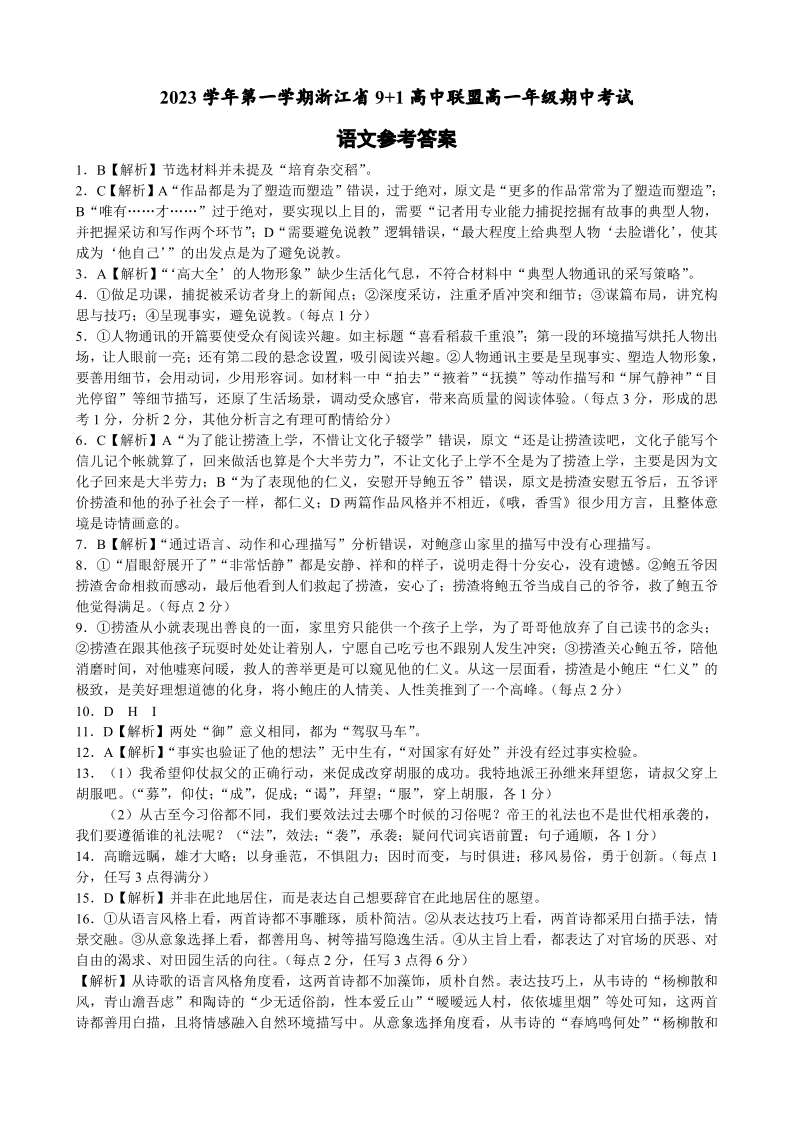 浙江省9+1高中联盟2023-2024学年高一上学期11月期中考试语文答案