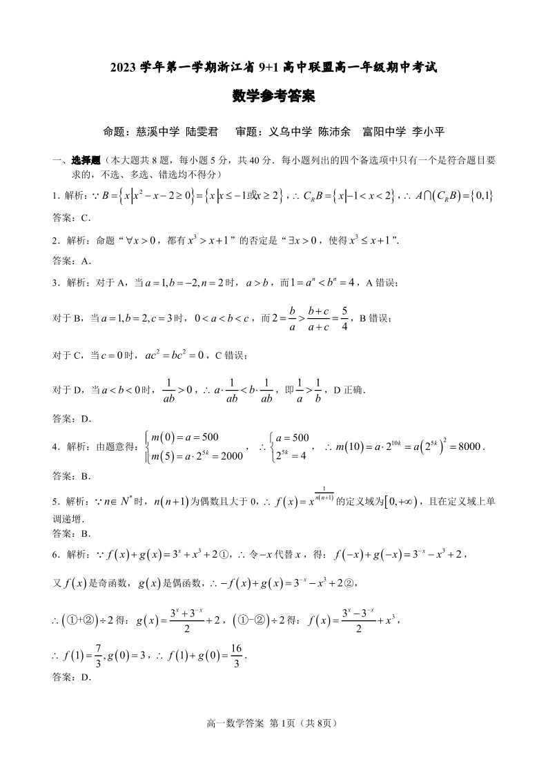浙江省9+1高中联盟2023-2024学年高一上学期11月期中考试数学答案