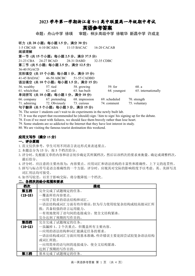 浙江省9+1高中联盟2023-2024学年高一上学期11月期中考试英语答案
