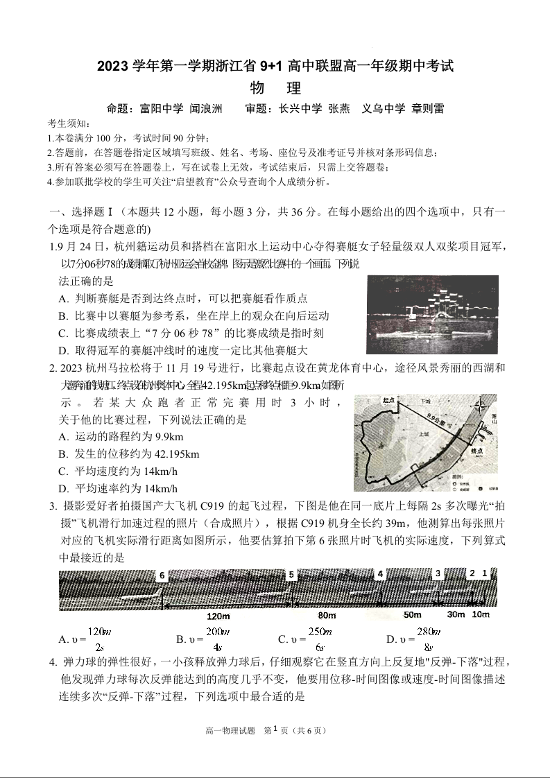 浙江省9+1高中联盟2023-2024学年高一上学期11月期中考试物理
