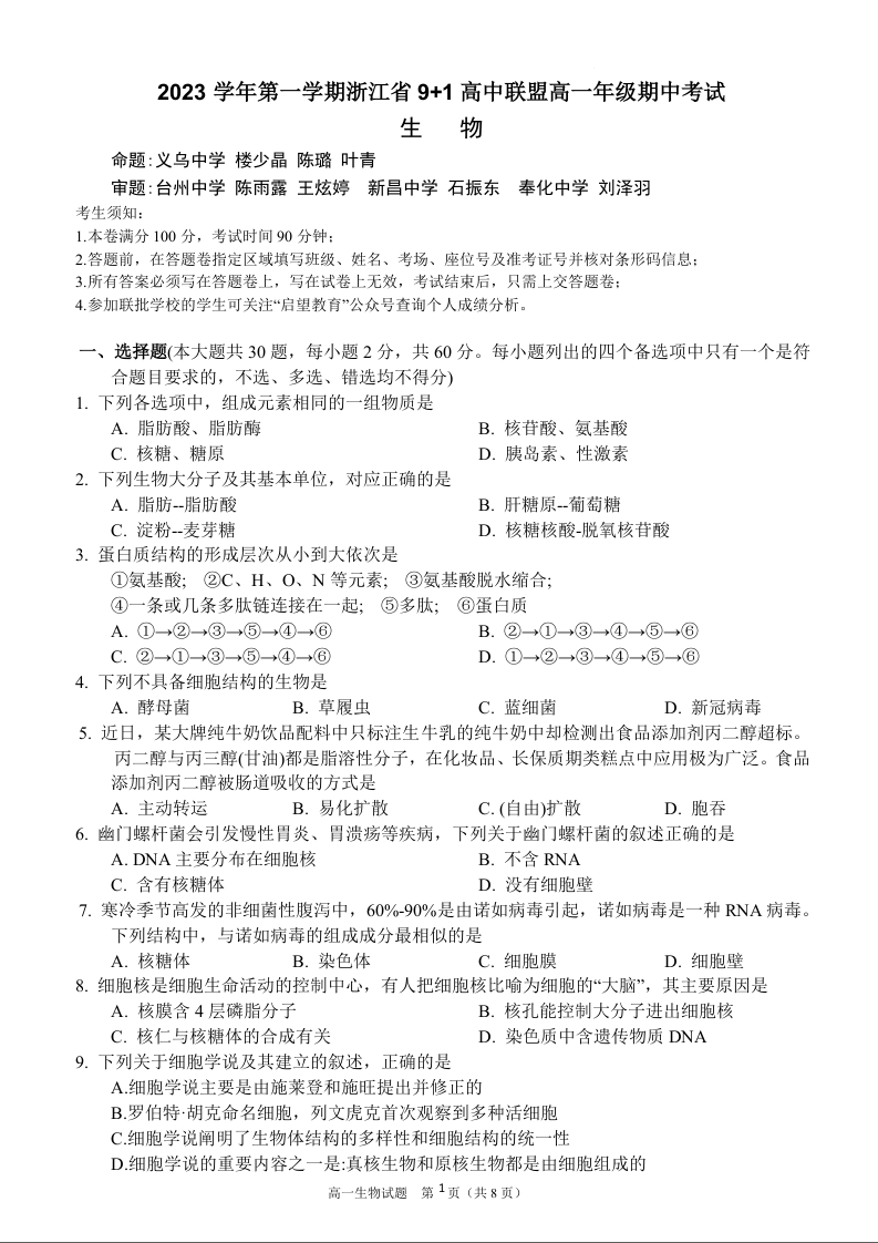 浙江省9+1高中联盟2023-2024学年高一上学期11月期中考试生物