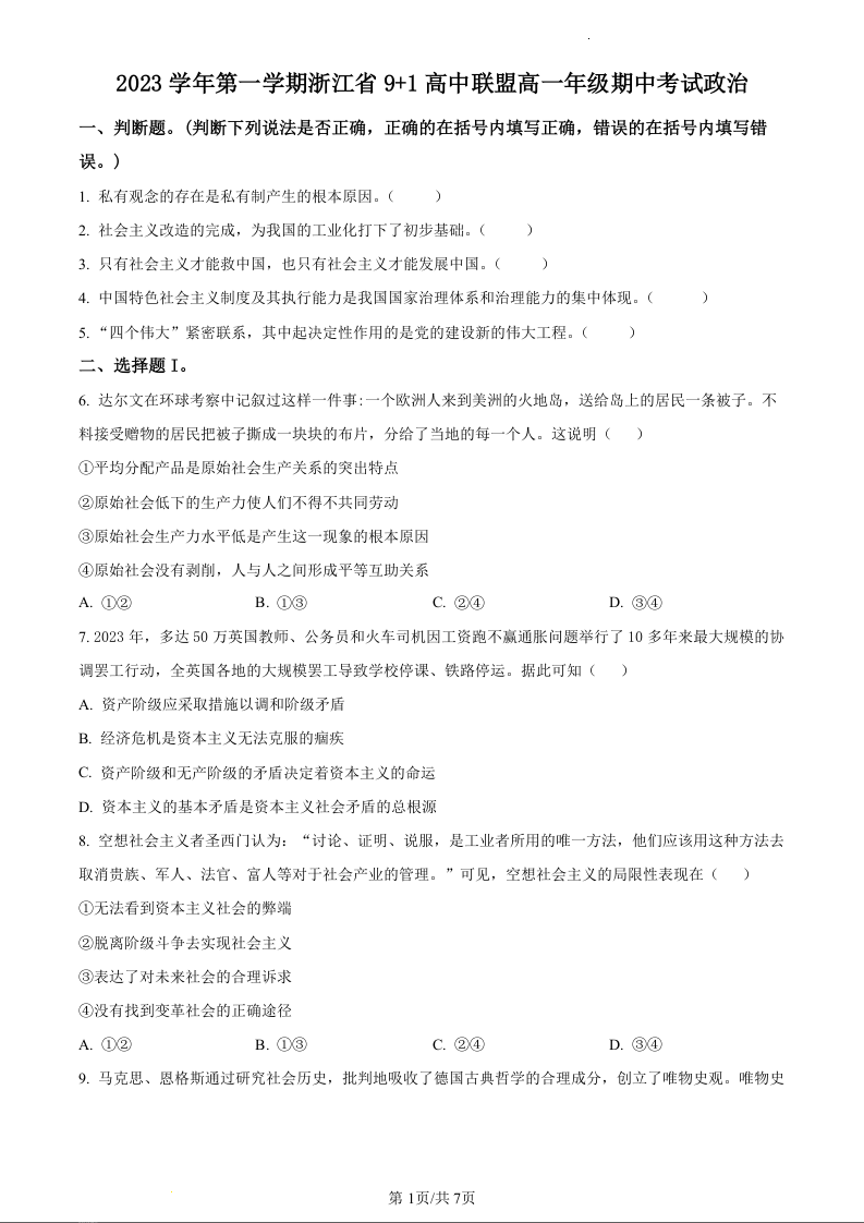 浙江省9+1高中联盟2023-2024学年高一上学期11月期中考试政治(原卷版)