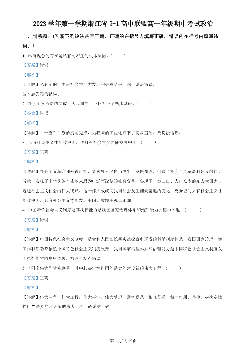 浙江省9+1高中联盟2023-2024学年高一上学期11月期中考试政治(精品解析版)