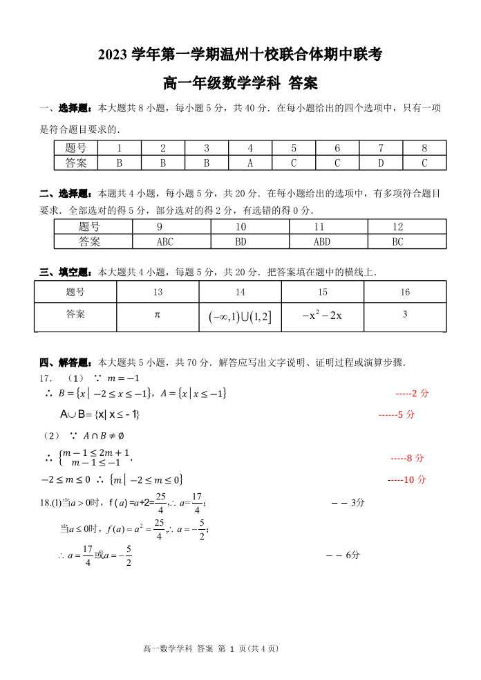 浙江省温州十校联合体2023学年第一学期高一年级期中联考数学答案