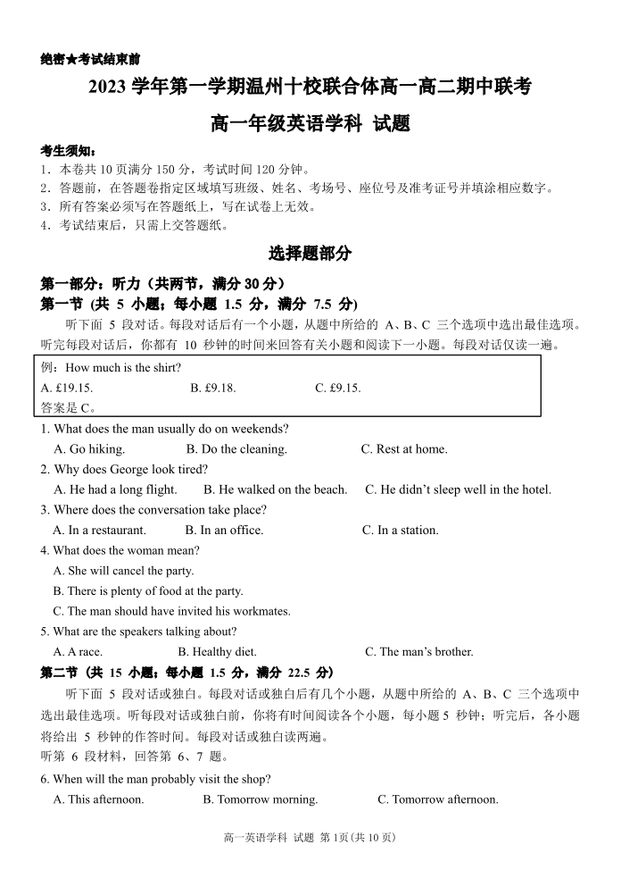 浙江省温州十校联合体2023学年第一学期高一年级期中联考英语