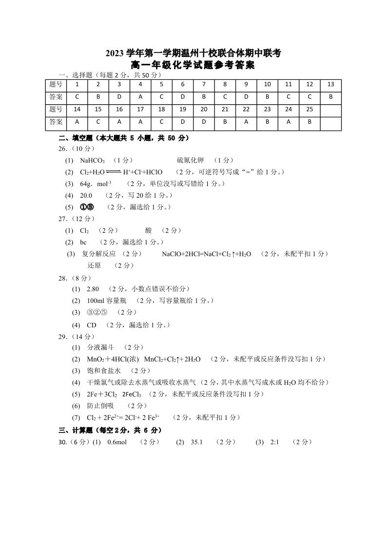 浙江省温州十校联合体2023学年第一学期高一年级期中联考化学答案