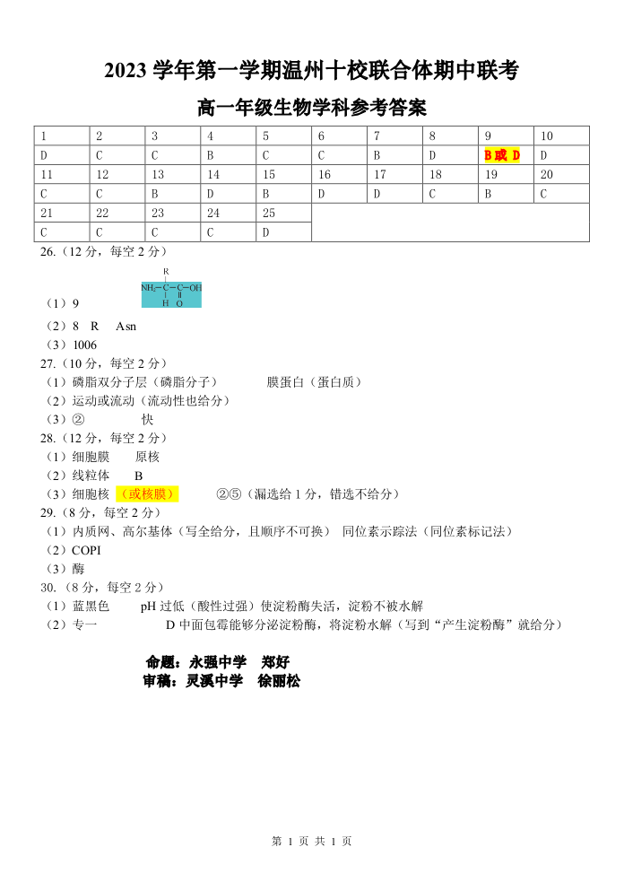 浙江省温州十校联合体2023学年第一学期高一年级期中联考生物答案