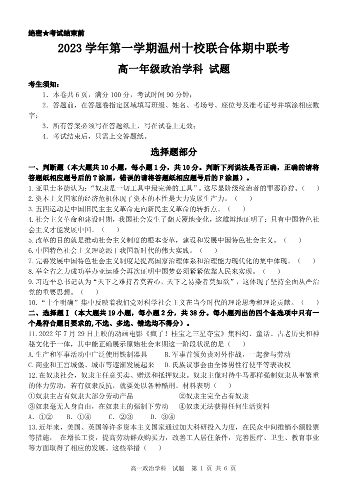 浙江省温州十校联合体2023学年第一学期高一年级期中联考政治