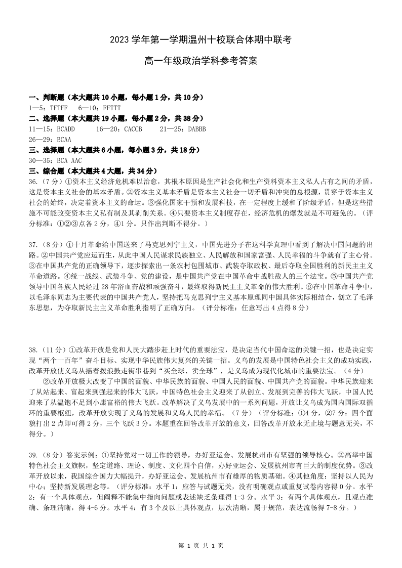 浙江省温州十校联合体2023学年第一学期高一年级期中联考政治答案