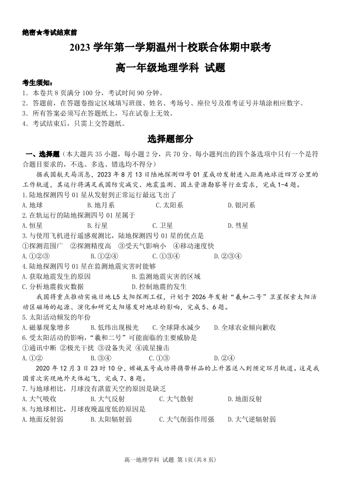 浙江省温州十校联合体2023学年第一学期高一年级期中联考地理