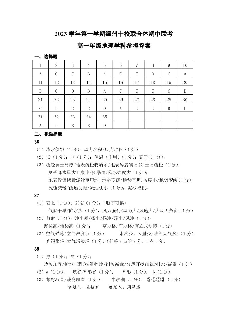 浙江省温州十校联合体2023学年第一学期高一年级期中联考地理答案