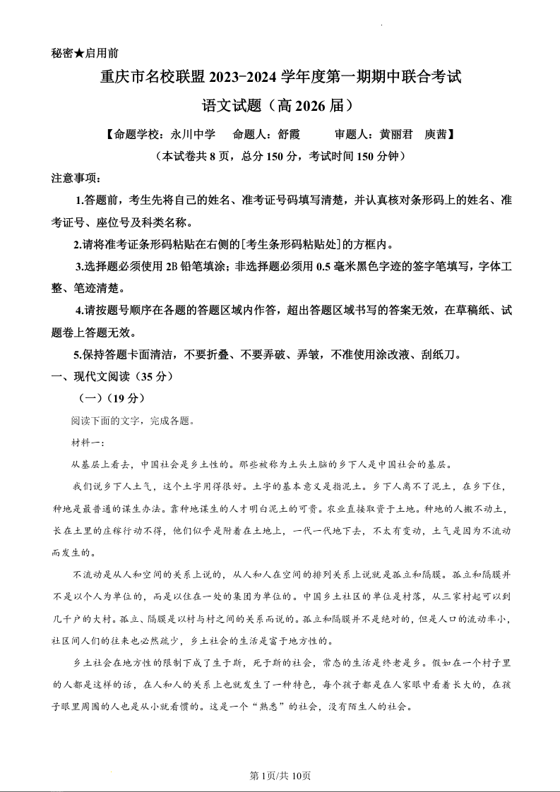 重庆市名校联盟2023-2024学年高一上学期期中联考语文(原卷版)