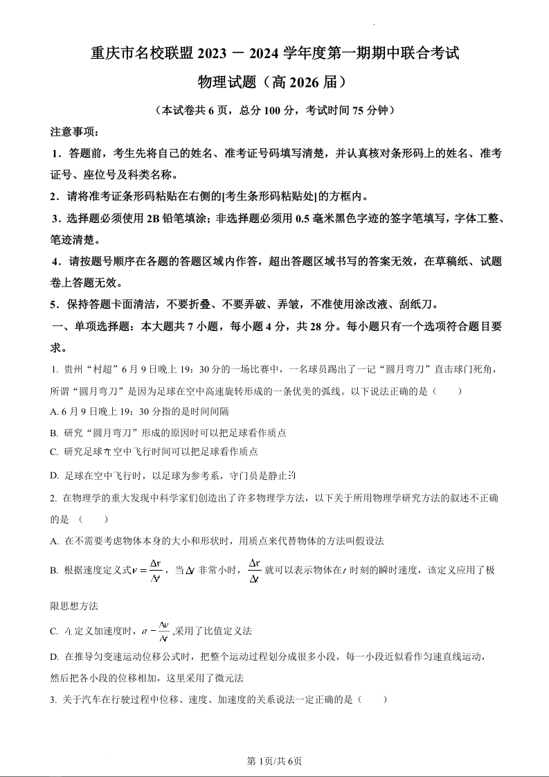 重庆市名校联盟2023-2024学年高一上学期期中联考物理(原卷版)