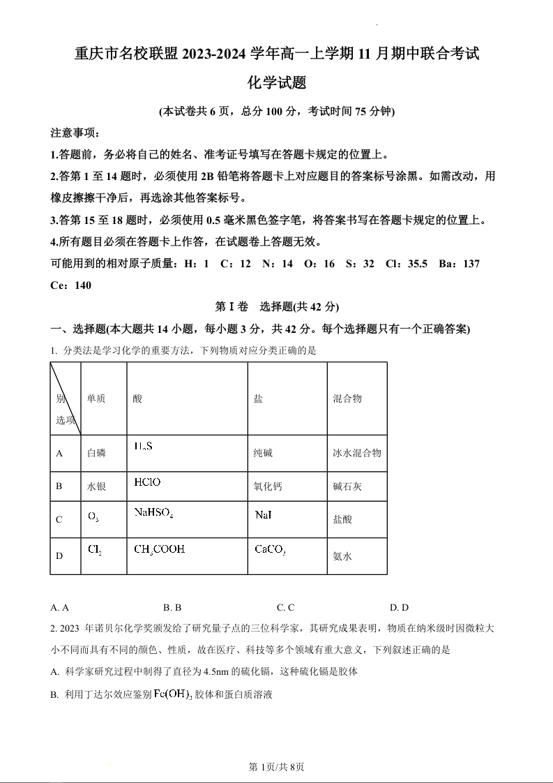 重庆市名校联盟2023-2024学年高一上学期期中联考化学(原卷版)