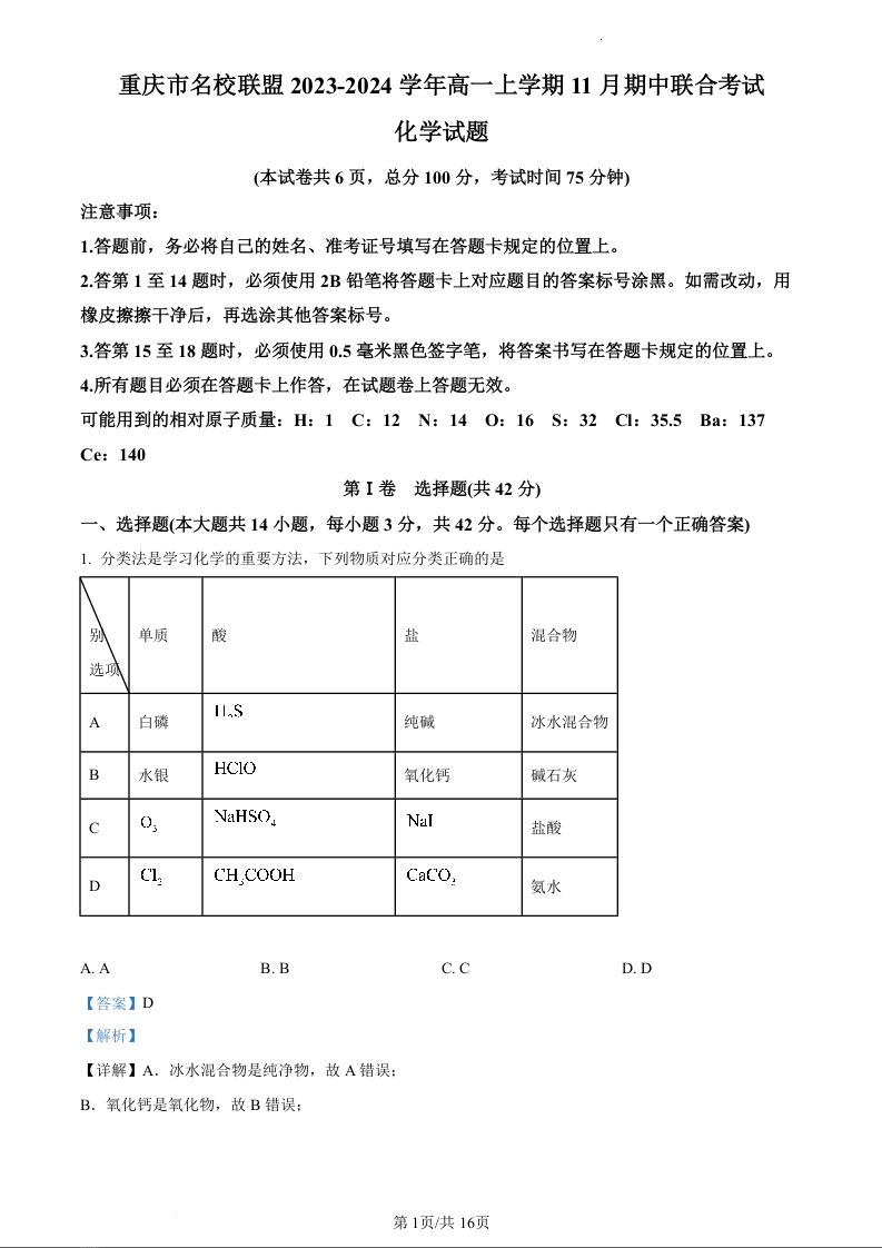 重庆市名校联盟2023-2024学年高一上学期期中联考化学(精品解析版)