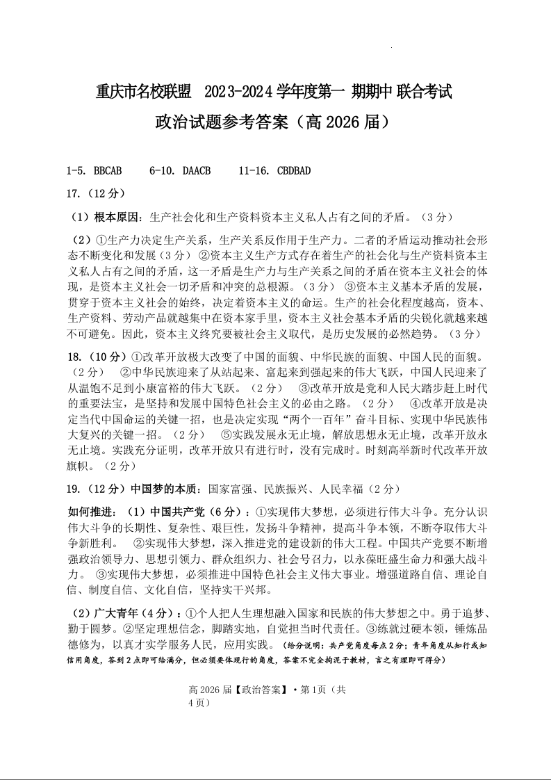 重庆市名校联盟2023-2024学年高一上学期期中联考政治答案
