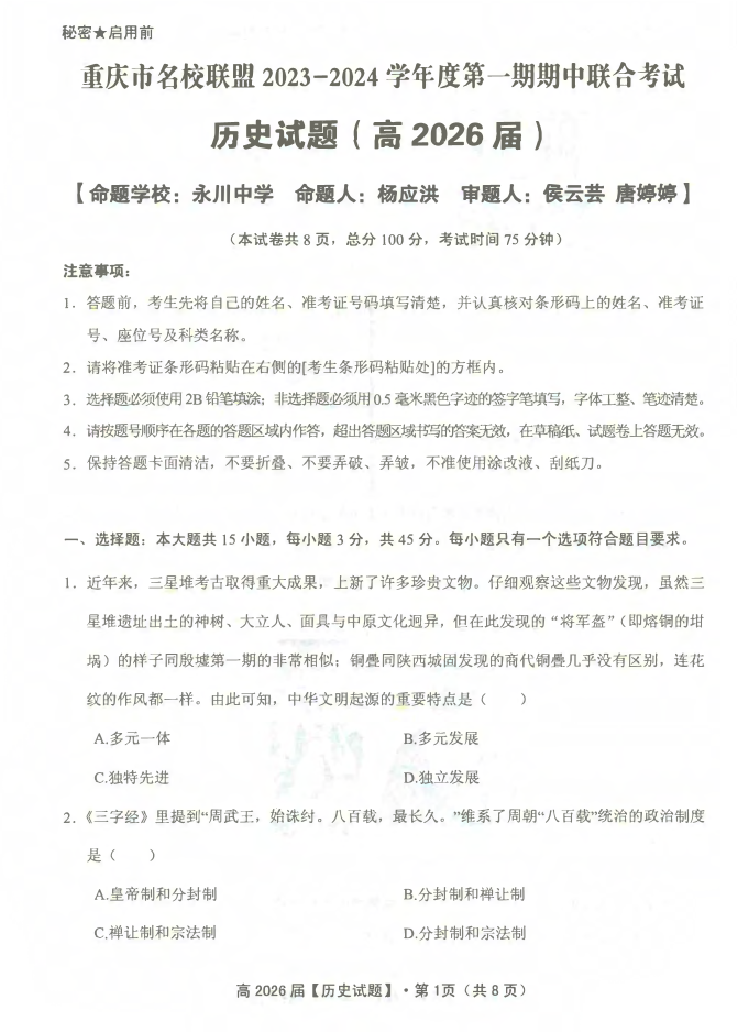 重庆市名校联盟2023-2024学年高一上学期期中联考历史