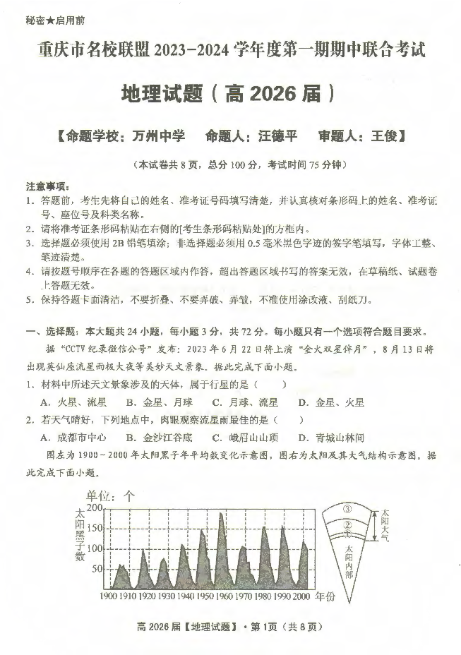 重庆市名校联盟2023-2024学年高一上学期期中联考地理