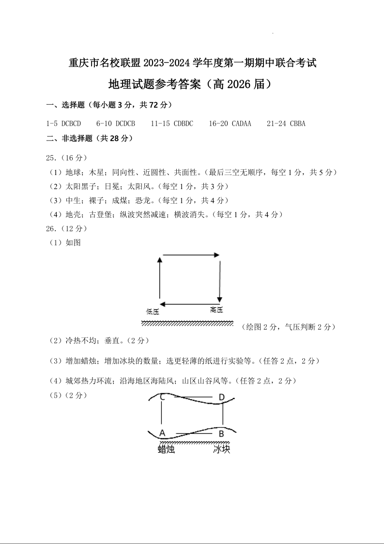 重庆市名校联盟2023-2024学年高一上学期期中联考地理答案