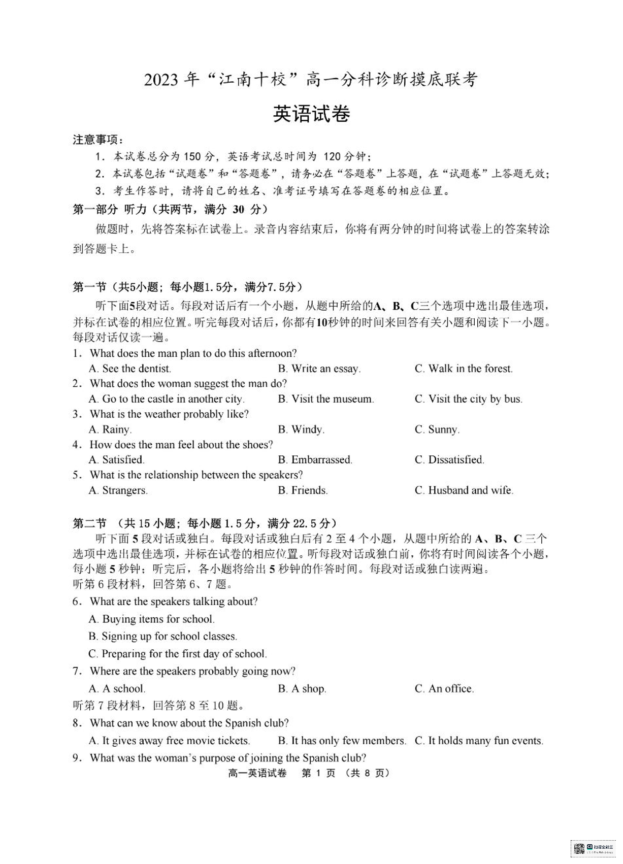 安徽省江南十校2023-2024学年高一上学期12月分科诊断模拟联考英语