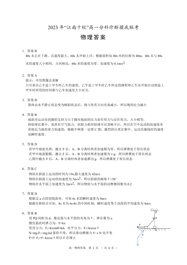 安徽省江南十校2023-2024学年高一上学期12月分科诊断模拟联考物理答案