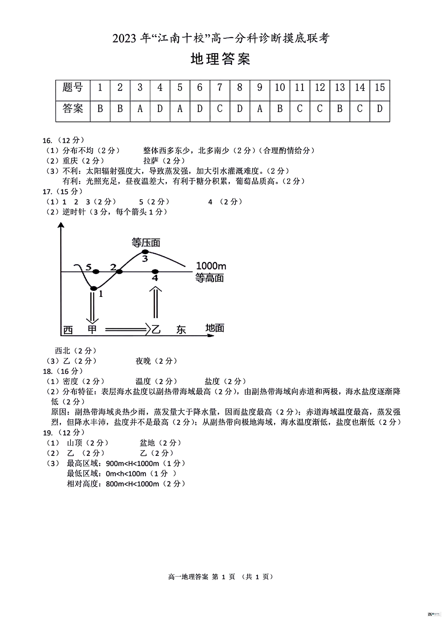 安徽省江南十校2023-2024学年高一上学期12月分科诊断模拟联考地理答案