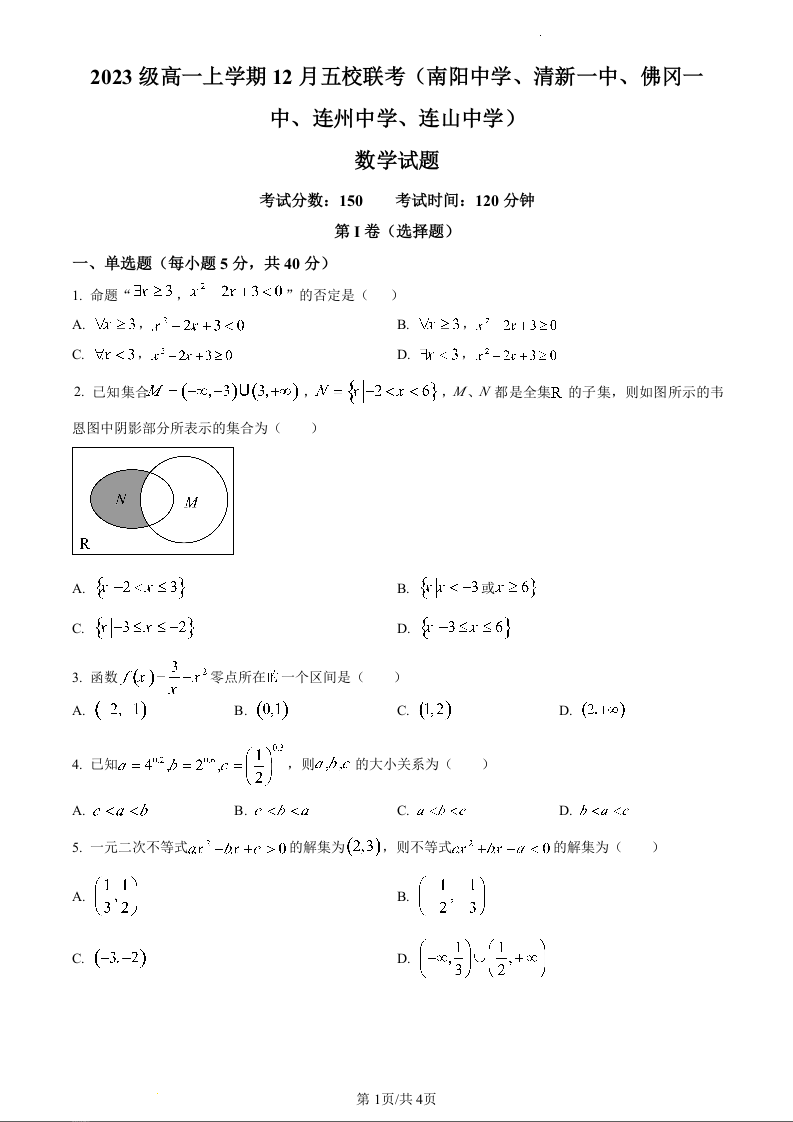 广东清远五校(南阳中学、清新一中、佛冈一中、连州中学、连山中学)2023-2024学年高一上学期12月联考数学(原卷版)