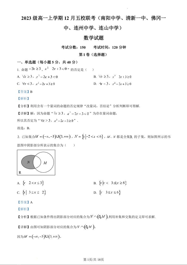 广东清远五校(南阳中学、清新一中、佛冈一中、连州中学、连山中学)2023-2024学年高一上学期12月联考数学(精品解析版)