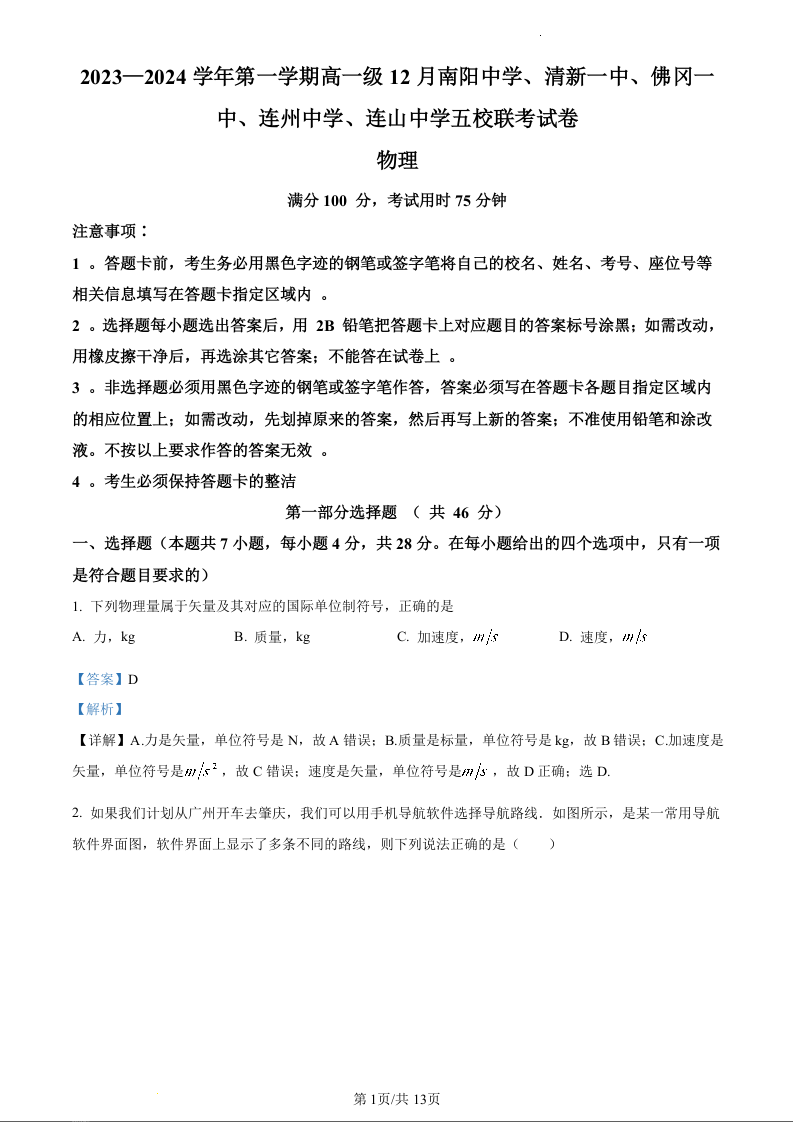 广东清远五校(南阳中学、清新一中、佛冈一中、连州中学、连山中学)2023-2024学年高一上学期12月联考物理(精品解析版)