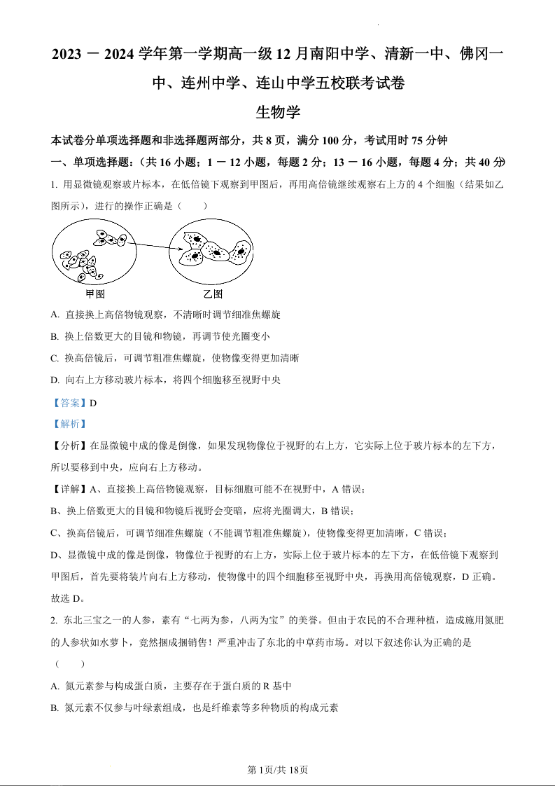 广东清远五校(南阳中学、清新一中、佛冈一中、连州中学、连山中学)2023-2024学年高一上学期12月联考生物(精品解析版)