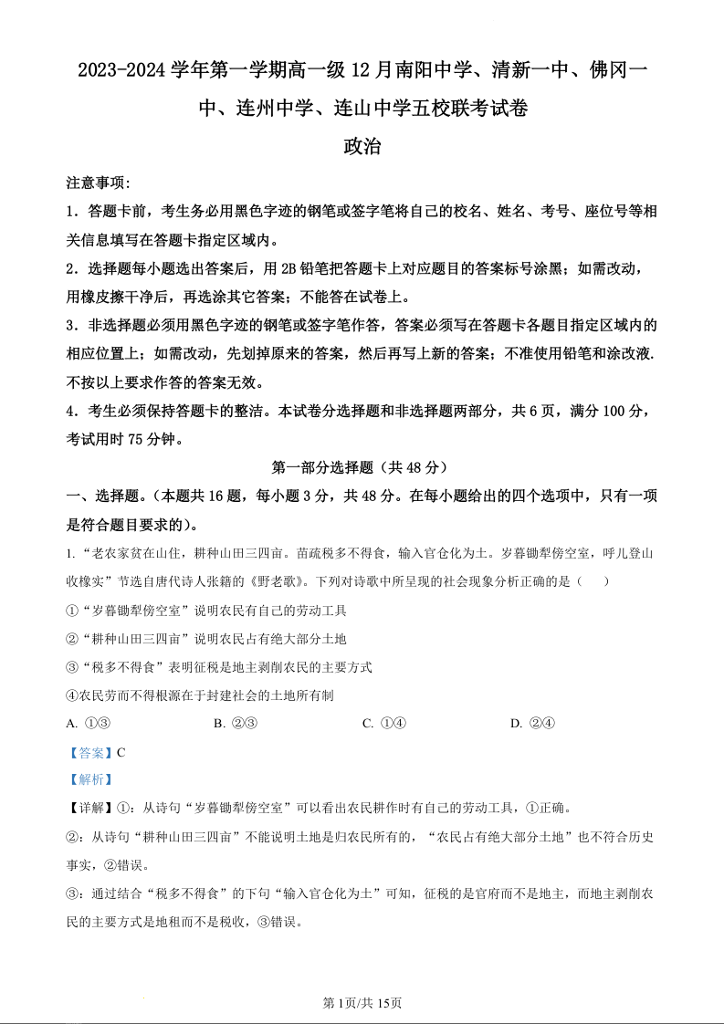 广东清远五校(南阳中学、清新一中、佛冈一中、连州中学、连山中学)2023-2024学年高一上学期12月联考政治(精品解析版)