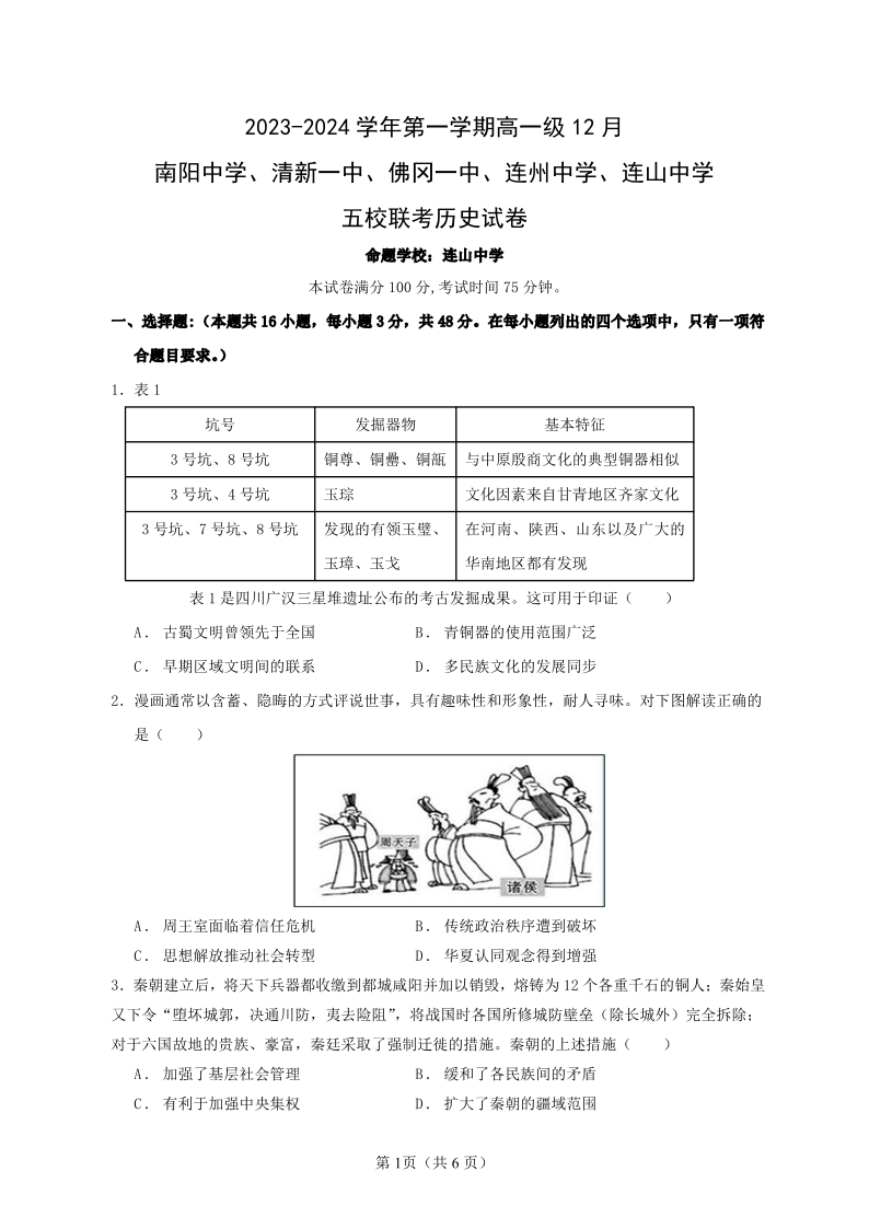 广东清远五校(南阳中学、清新一中、佛冈一中、连州中学、连山中学)2023-2024学年高一上学期12月联考历史
