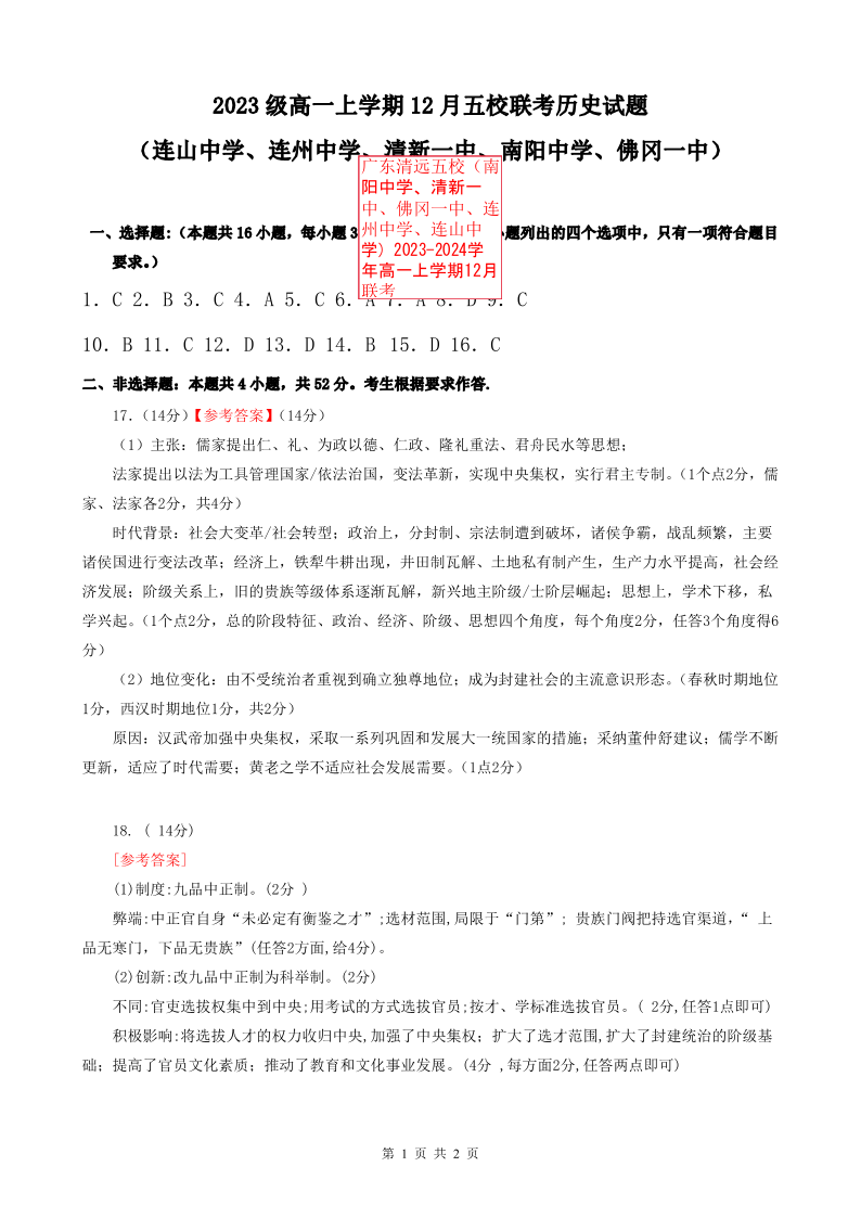 广东清远五校(南阳中学、清新一中、佛冈一中、连州中学、连山中学)2023-2024学年高一上学期12月联考历史答案