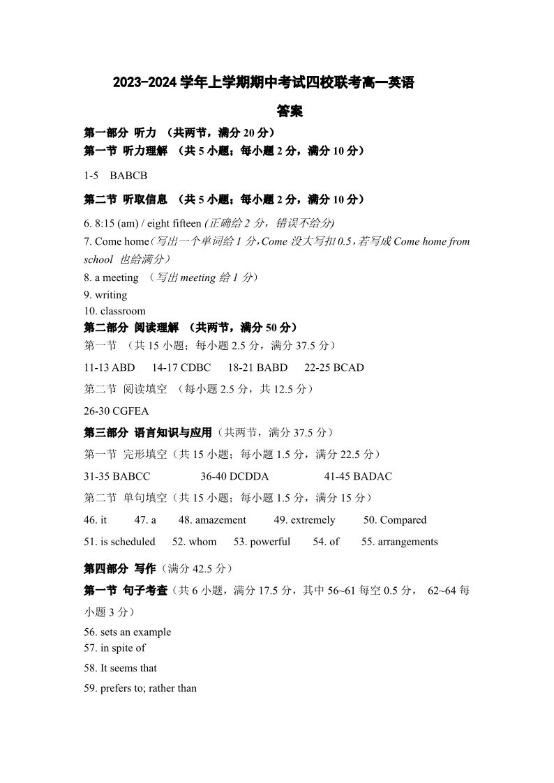广东省东莞市四校2023-2024学年高一上学期12月期中联考英语答案