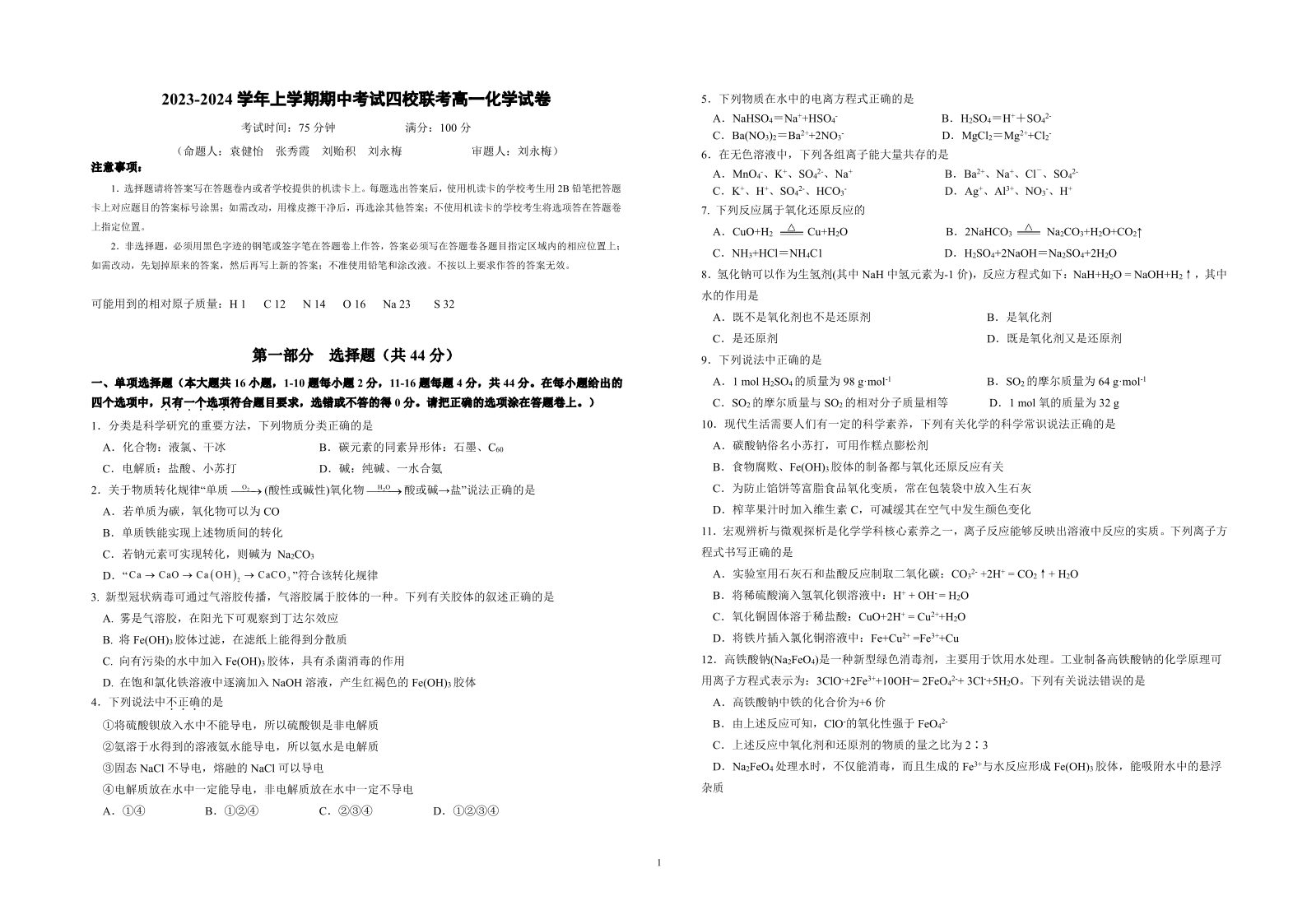 广东省东莞市四校2023-2024学年高一上学期12月期中联考化学