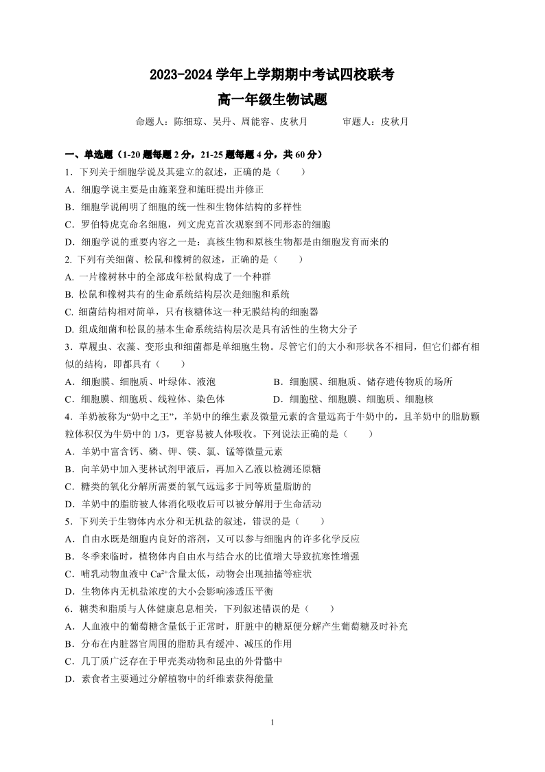 广东省东莞市四校2023-2024学年高一上学期12月期中联考生物