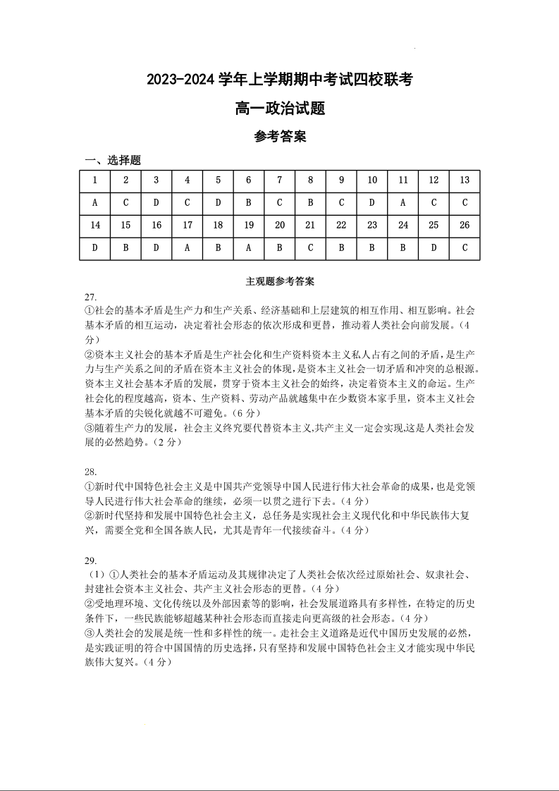 广东省东莞市四校2023-2024学年高一上学期12月期中联考政治答案