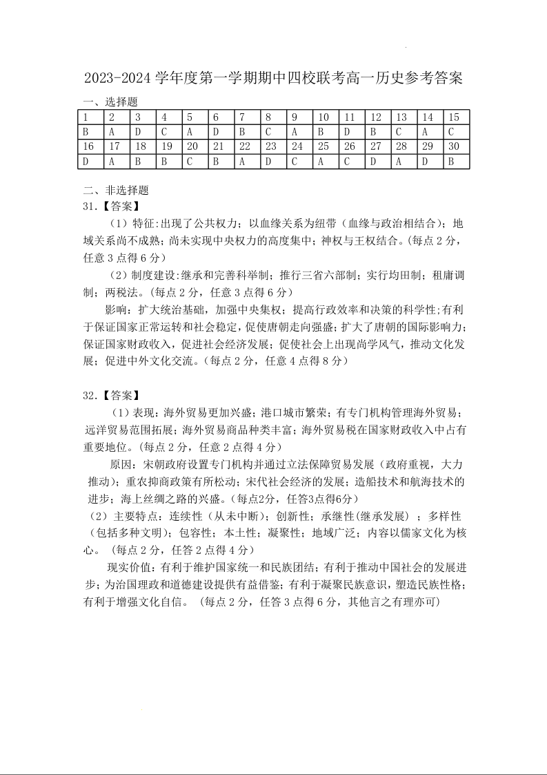 广东省东莞市四校2023-2024学年高一上学期12月期中联考历史答案