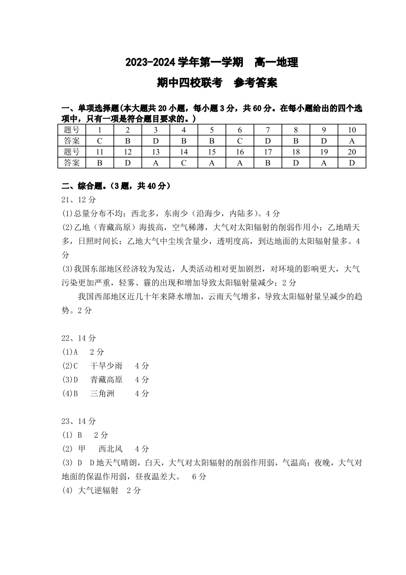 广东省东莞市四校2023-2024学年高一上学期12月期中联考地理答案
