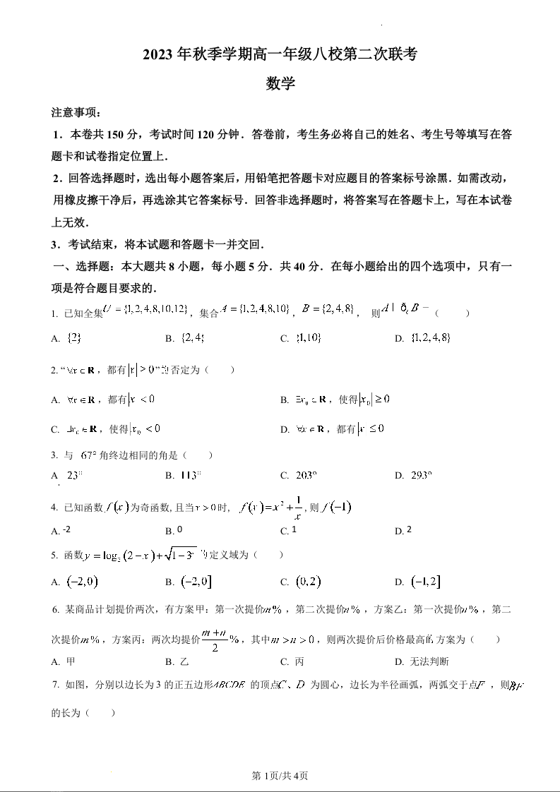广西壮族自治区河池市八校2023-2024学年高一上学期第二次联考数学(原卷版)