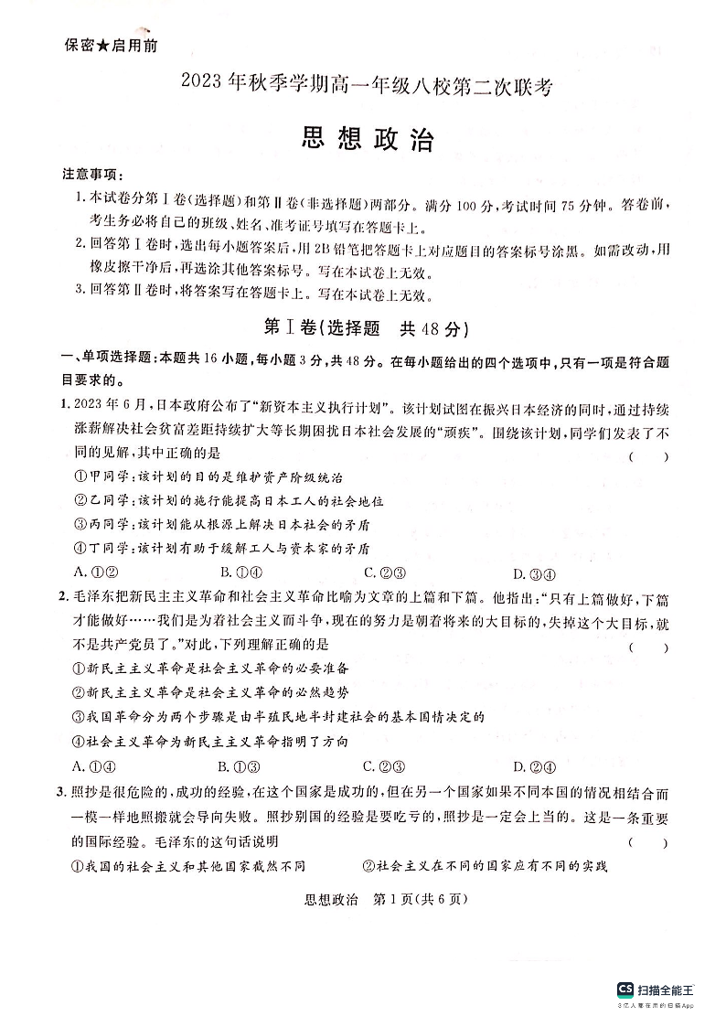 广西壮族自治区河池市八校2023-2024学年高一上学期第二次联考政治