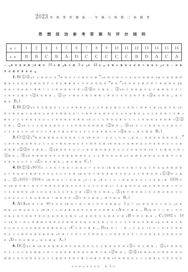 广西壮族自治区河池市八校2023-2024学年高一上学期第二次联考政治答案