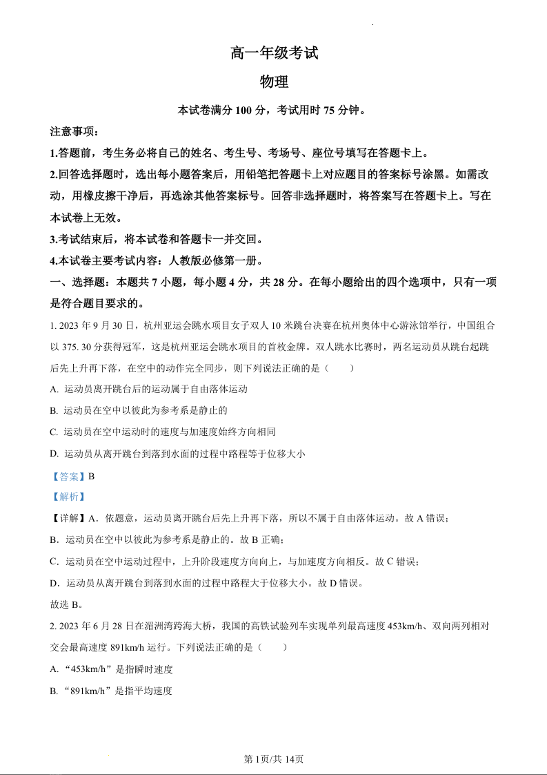 贵州省2023-2024学年高一上学期12月月考物理(精品解析版)