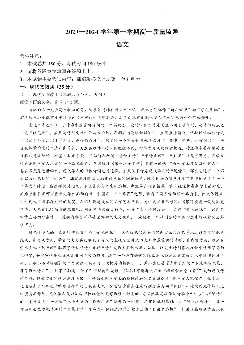 贵州省六盘水市水城区2023-2024学年高一上学期12月月考语文+答案