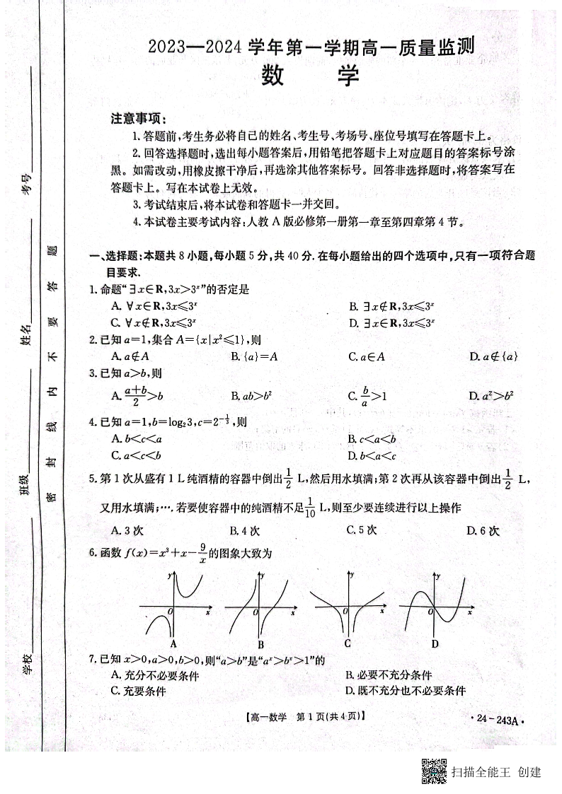 贵州省六盘水市水城区2023-2024学年高一上学期12月月考数学
