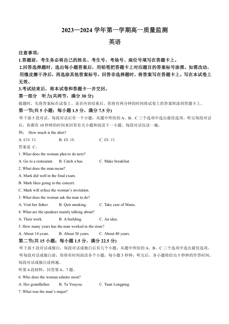 贵州省六盘水市水城区2023-2024学年高一上学期12月月考英语+答案