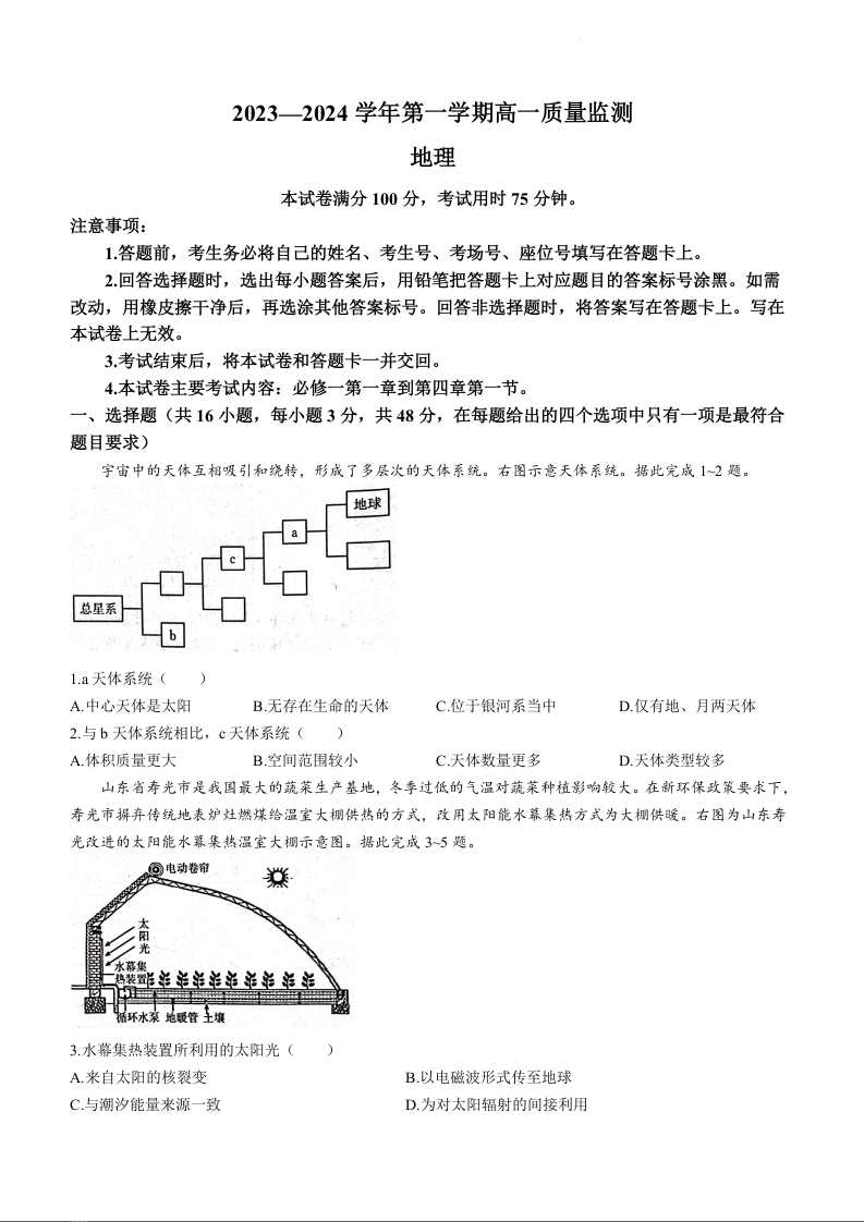 贵州省六盘水市水城区2023-2024学年高一上学期12月月考地理+答案